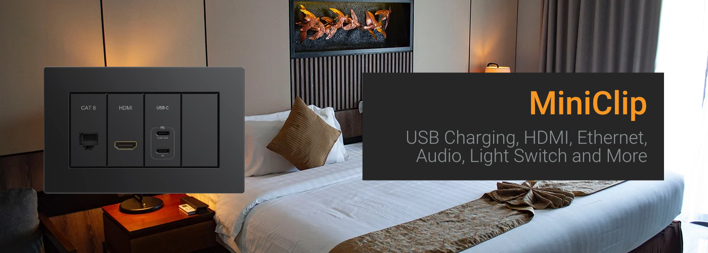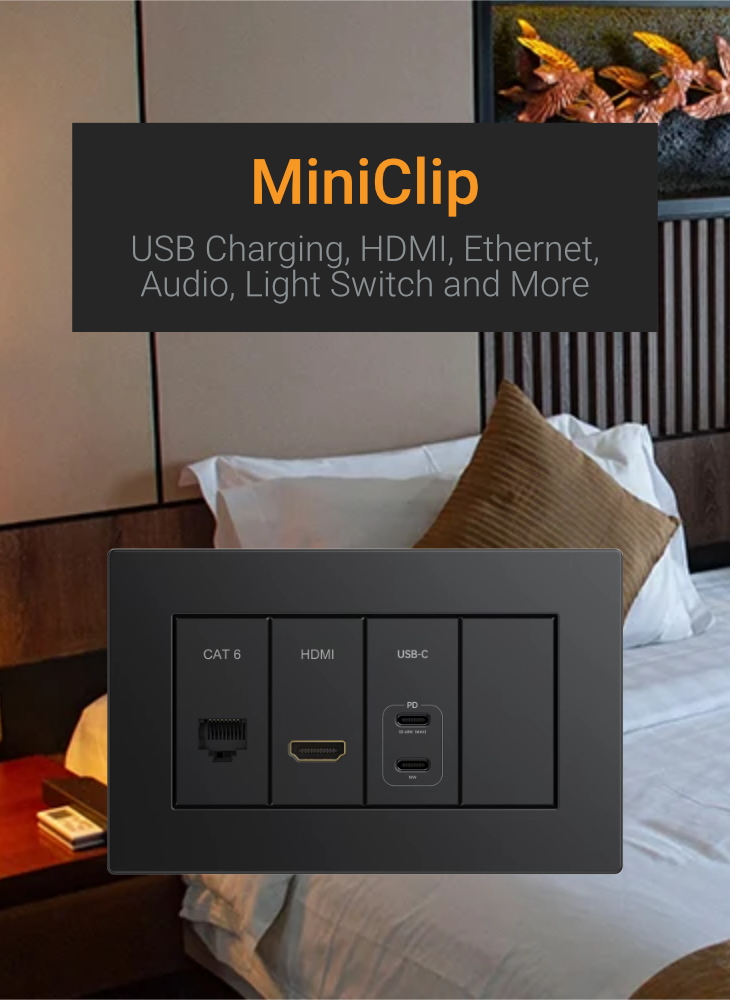 The MiniClip range includes ports for USB charging, AV and data. This modular system is designed to allow you to build a custom media panel to best suit the needs of your guests. Modules simply clip into a carrier and a trim is attached to create a custom media solution.