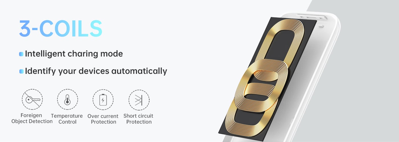 • 3 coils to ensure charging regardless of device orientation.