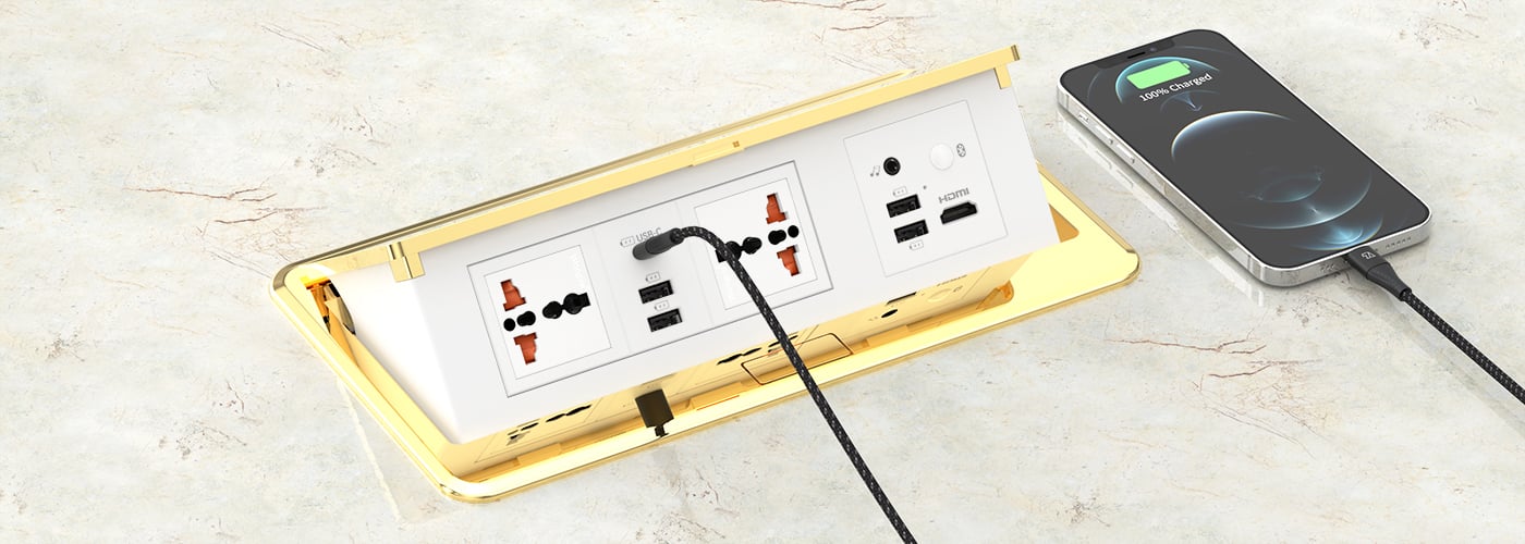 - In desk popup with polished gold effect finish and matte soft touch white module (other finishes available).